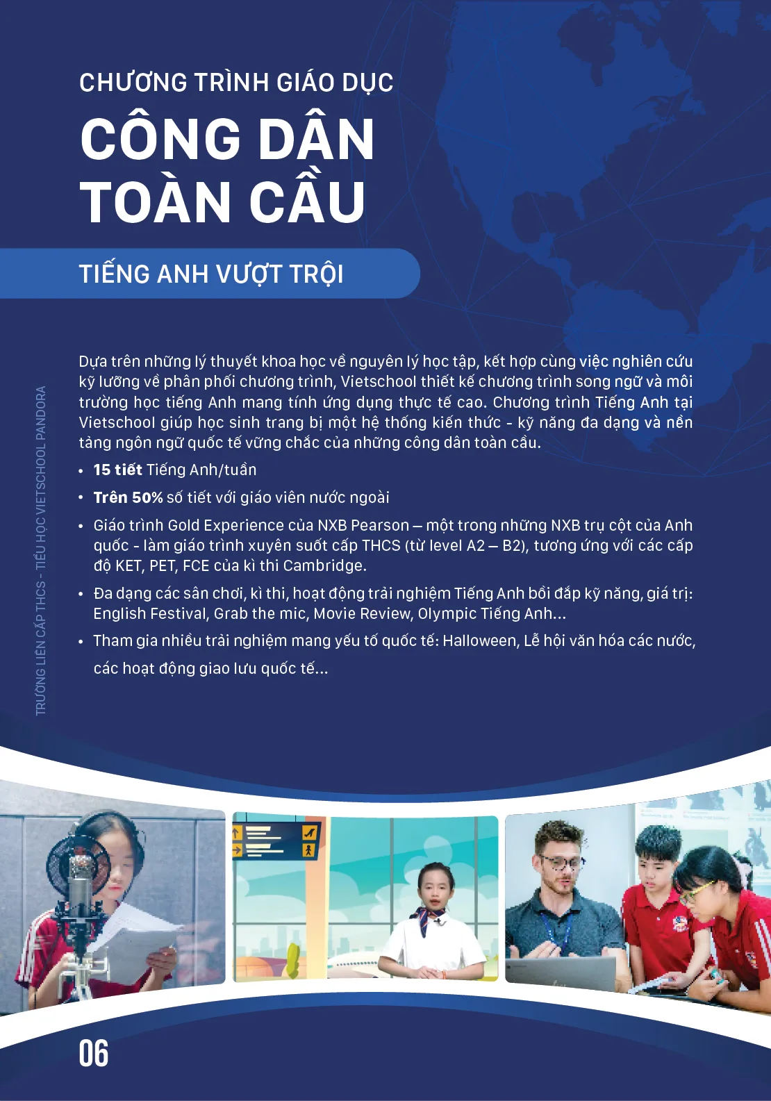 Dựa trên những lý thuyết khoa học về nguyên lý học tập, kết hợp cùng việc nghiên cứu kỹ lưỡng về phân phối chương trình, Vietschool thiết kế chương trình song ngữ và môi trường học tiếng Anh mang tính ứng dụng thực tế cao. Chương trình Tiếng Anh tại Vietschool giúp học sinh trang bị một hệ thống kiến thức – kỹ năng đa dạng và nền tảng ngôn ngữ quốc tế vững chắc của những công dân toàn cầu.